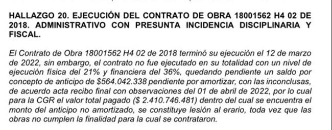 Es por eso que la Contraloría encontró que aunque ese contrato terminó su ejecución el 12 de marzo de 2022, no fue ejecutado en su totalidad con un nivel de avance de 21% y quedando con un saldo, por concepto de anticipo, por 564.000 millones de pesos, que no se amortizaron, es decir, no se demostró en qué se gastaron.