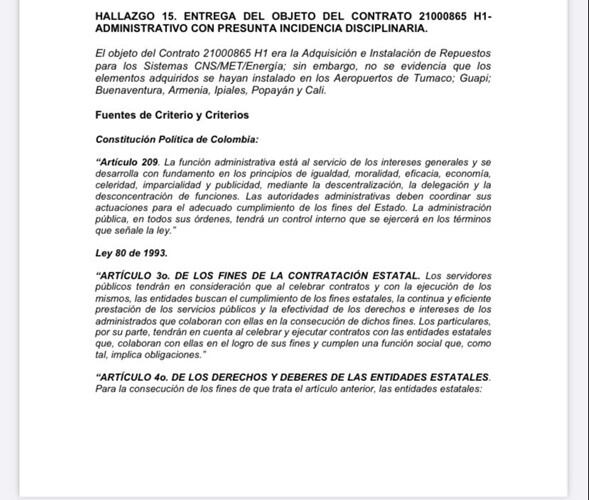 Pero hay más. En el informe de la Contraloría se alerta por un contrato que firmó la Aerocivil para la adquisición e instalación de repuestos para los sistemas CNS/MET/Energía en el que no se evidenció que los elementos adquiridos hayan sido instalados en os aeropuertos de Tumaco, Guapi, Buenaventura, Armenia, Ipiales, Popayán y Cali. En este caso, por falta de gestión, se podría configurar un detrimento patrimonial.