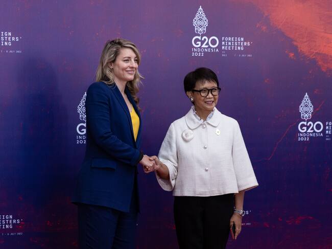 NUSA DUA, INDONESIA - JULY 08: The Indonesian Minister for Foreign Affairs, Retno Marsudi (R) greets the Minister for Foreign Affairs of Canada, Melanie Joly (L) during arrival of the G20 Foreign Ministers and Head of Department at the Grand Ballroom Mulia Hotel on July 08, 2022 in Nusa Dua, Indonesia. (Photo by Robertus Pudyanto/Getty Images) / Robertus Pudyanto
