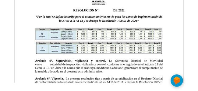 La Secretaría de Movilidad en Bogotá dio a conocer que se espera que en los próximos días se firme una resolución por parte del secretario Felipe Ramírez, que permite ampliar el servicio de parqueo en vía y autorizar que sea ahora fraccionado y no por mínimo una hora como venía ocurriendo, sino por fracciones de 10 a 30 minutos en las 13 zonas establecidas en localidades como Chapinero y Usaquén.