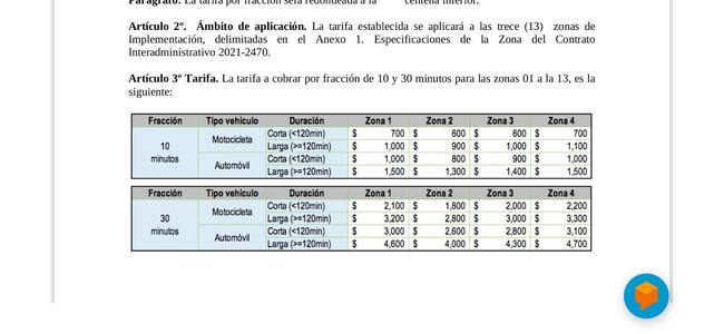 Motocicletas, entre 60 y 1.100 pesos, dependiendo de la zona, pero recuerde que su valor varía de acuerdo a la vocación comercial de la zona. “Los automóviles, por la fracción de 10 minutos, pagarán una tarifa entre 800 y 1.500 pesos dependiendo de la zona”.