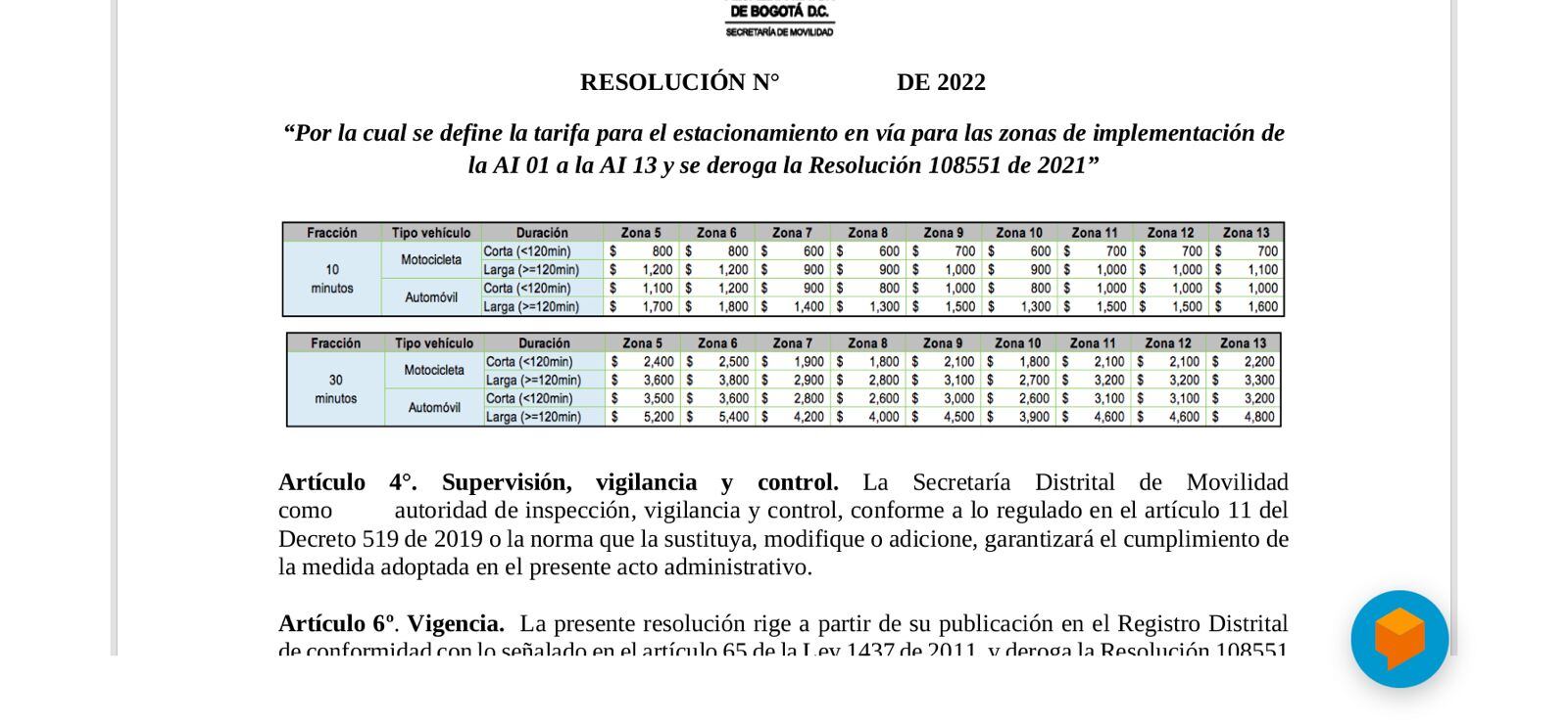 La Secretaría de Movilidad en Bogotá dio a conocer que se espera que en los próximos días se firme una resolución por parte del secretario Felipe Ramírez, que permite ampliar el servicio de parqueo en vía y autorizar que sea ahora fraccionado y no por mínimo una hora como venía ocurriendo, sino por fracciones de 10 a 30 minutos en las 13 zonas establecidas en localidades como Chapinero y Usaquén.