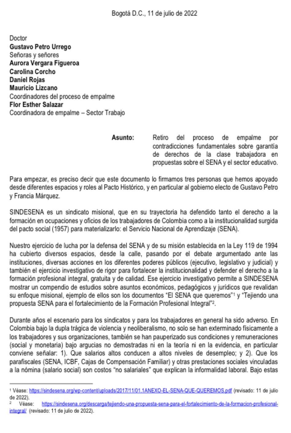 Sindesena, el sindicato del Sena, anunció su retiro de empalme con el gobierno electo de Gustavo Petro. En una carta explican los motivos de su decisión.