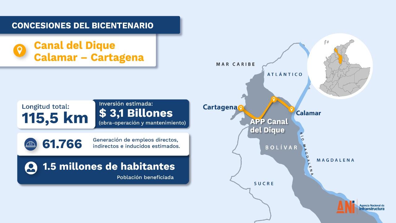 La ANI recordó que “el megaproyecto Canal del Dique es una iniciativa de la que se viene hablando hace más de 50 años en el país y era primordial para beneficiar entre otras cosas, el transporte de mercancías por sus aguas hasta los puertos del Caribe, pero también porque representa un alivio a los problemas de sedimentación y riesgos de inundación que incluso hace más de 10 años causaron una enorme tragedia en la Costa Caribe dejando más de 100 mil damnificados”.
