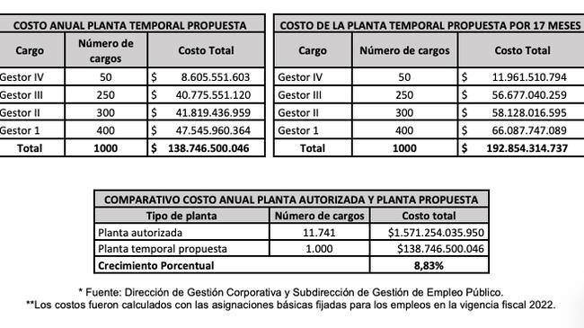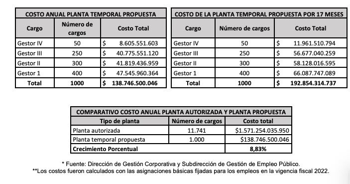 Estos nuevos cargos tendrían un costo anual que asciende a la suma de $138.746 millones. La vigencia de los empleos temporales a crear se extendería hasta el 31 de diciembre de 2023, en el número y en la denominación que se indica señalándose el costo: