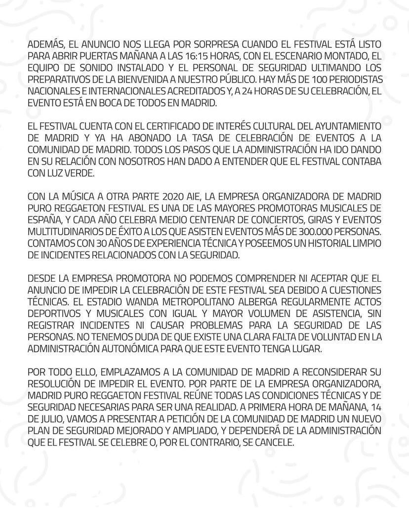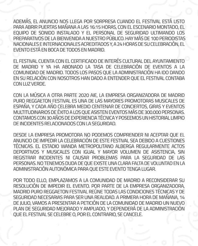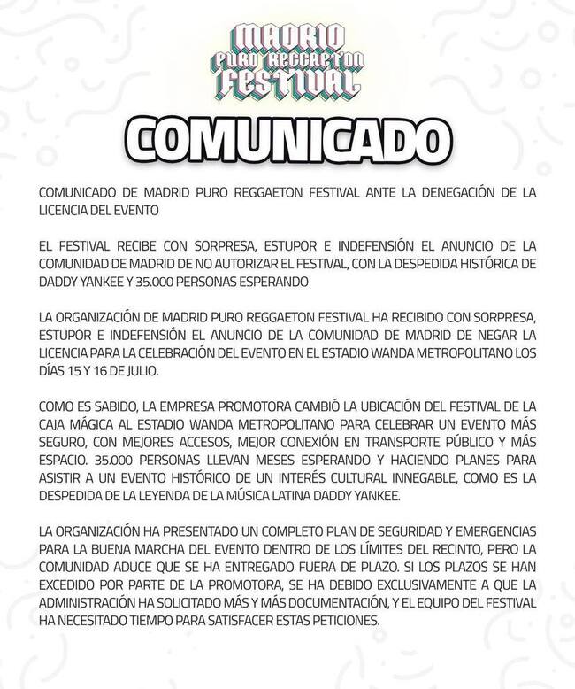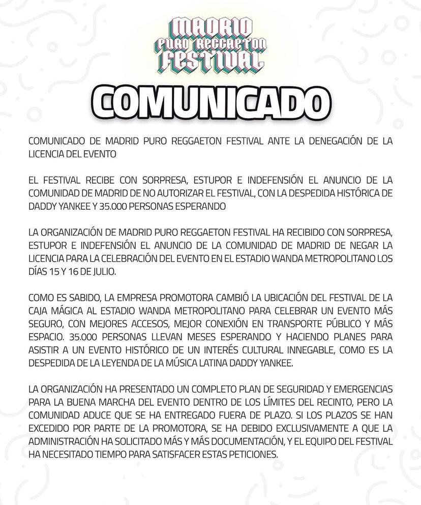 Comunicado que confirma la cancelación del festival “Madrid puro reggaetón”.