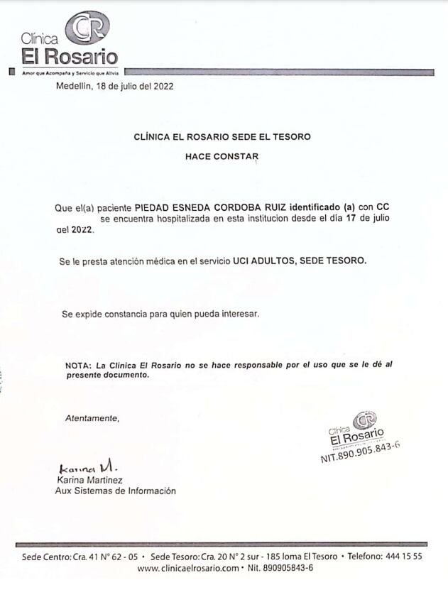 Según informó la unidad médica a través de un comunicado, Córdoba “se encuentra hospitalizada en esta institución desde el día 17 de julio de 2022. Se le presta atención médica en el servicio de UCI adultos”.