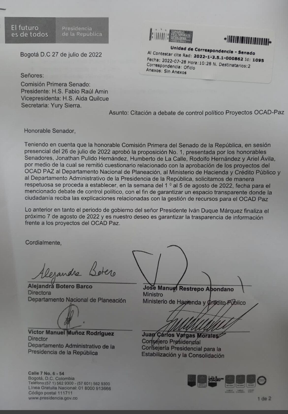 A través de una carta el director del Departamento Administrativo de la Presidencia, Víctor Muñoz, la directora del Departamento de Planeación, Alejandra Botero, el ministro de Hacienda, Jose Manuel Restrepo y también el consejero encargado para la estabilización, Juan Carlos Vargas pidieron a la Comisión Primera del Senado establecer la fecha del debate de control político sobre el destino de los recursos para los OCAD Paz y los municipios que tienen Programas de Desarrollo con Enfoque Territorial antes de que se acabe el Gobierno de Iván Duque, es decir antes del 7 de agosto.