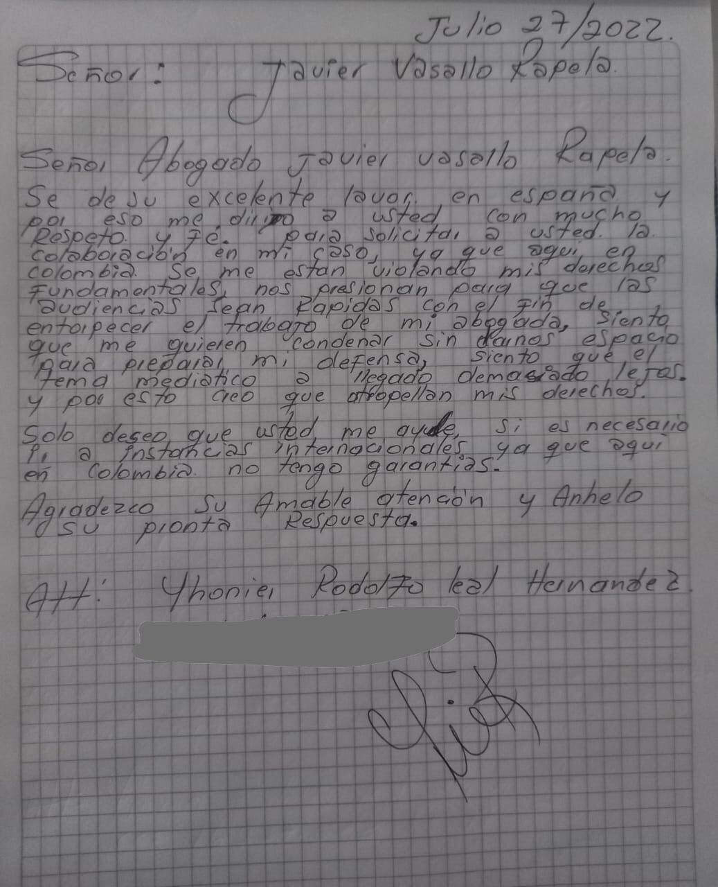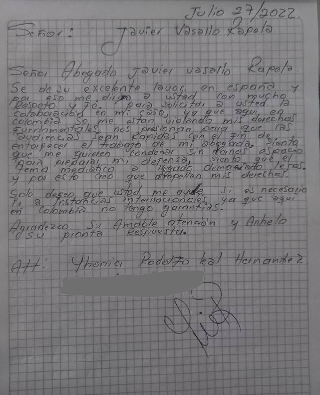 Según la abogada Ana Julieth Velázquez, en la misiva, enviada desde su celda en la cárcel la Picota en Bogotá, el acusado Jhonier Leal le pide al abogado su apoyo en el proceso, el cual considera se está llevando de manera injusta y en el que se le están violando, según él, sus derechos fundamentales. Le pide ayuda, incluso, para llevar su proceso a instancias internacionales si llega el caso.