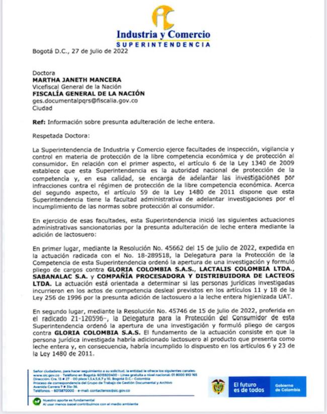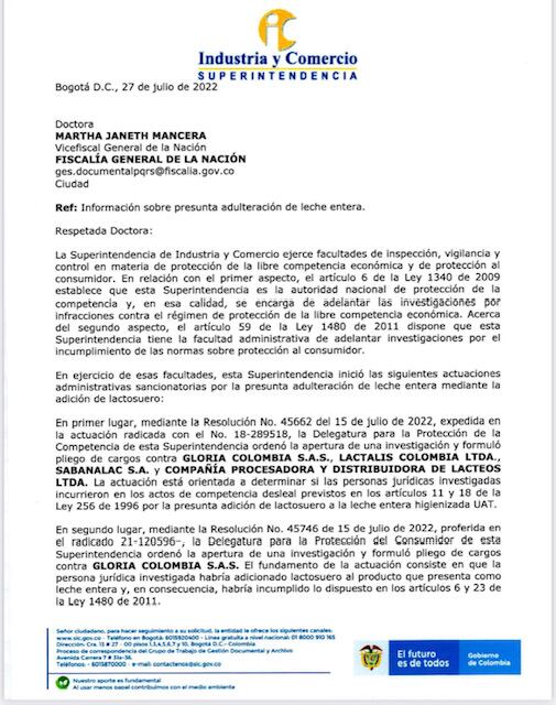 W Radio conoció que la Superintendencia de Industria y Comercio remitió pliego de cargos a la Fiscalía General de la Nación en contra de las empresas de lácteos que estarían rindiendo la leche entera con lactosuero. La carta la envío directamente el superintendente Andrés Barreto a la vicefiscal general Martha Janeth Mancera.