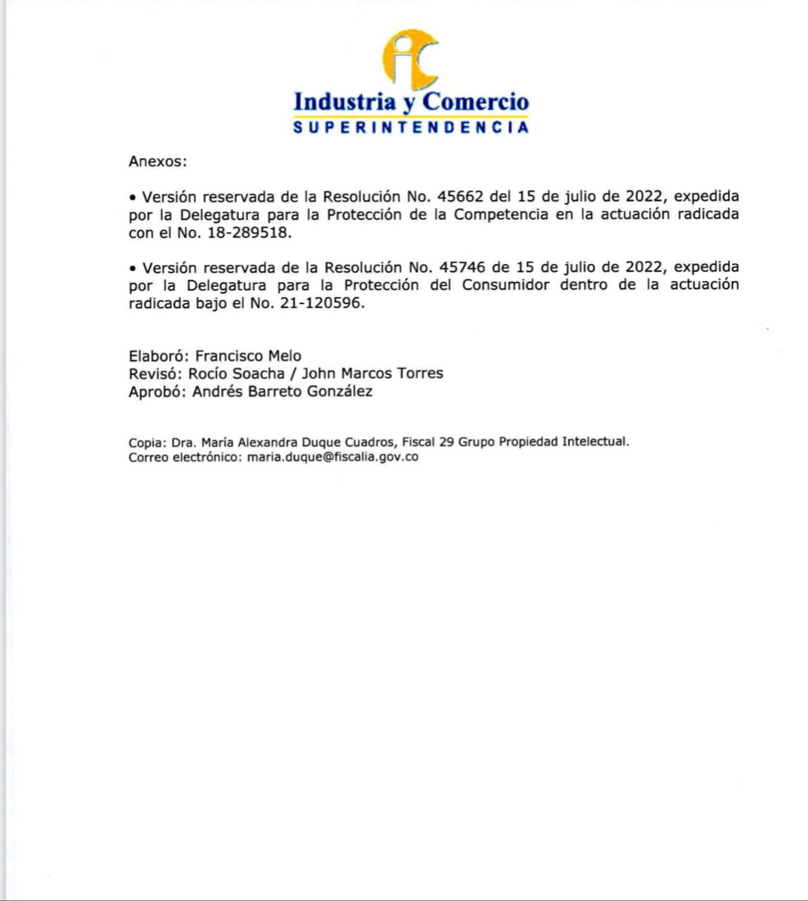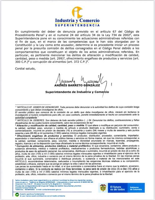 En el documento, Barreto le pide a la Fiscalía determinar si es procedente iniciar un proceso penal por la presunta comisión de delitos consagrados en el Código Penal debido a los comportamientos que constituyen el objeto de los actos administrativos referidos. “En particular, es pertinente mencionar los delitos de alteración y modificación de calidad, cantidad, peso o medida, ofrecimiento engañoso de productos o servicios y corrupción de alimentos”.