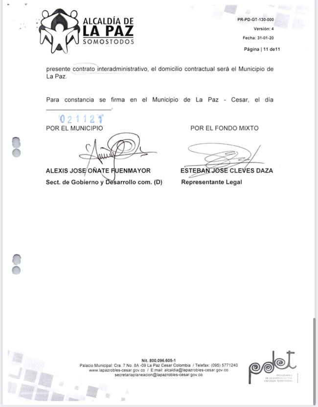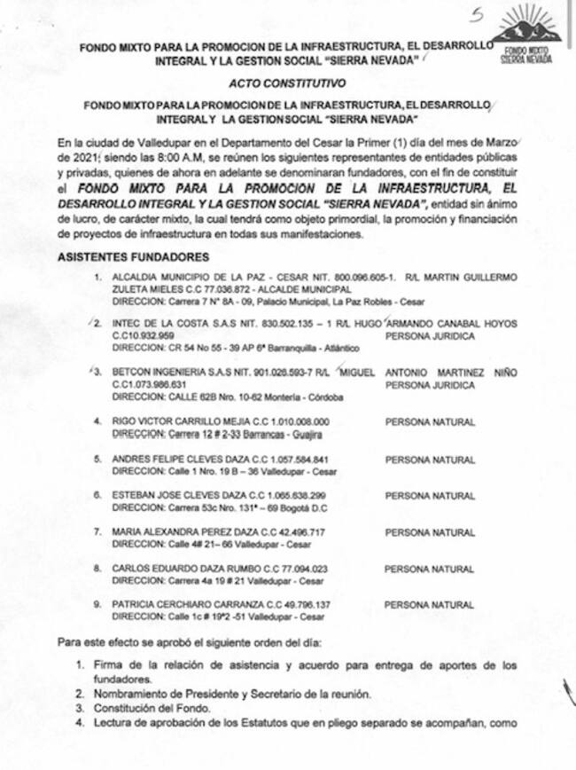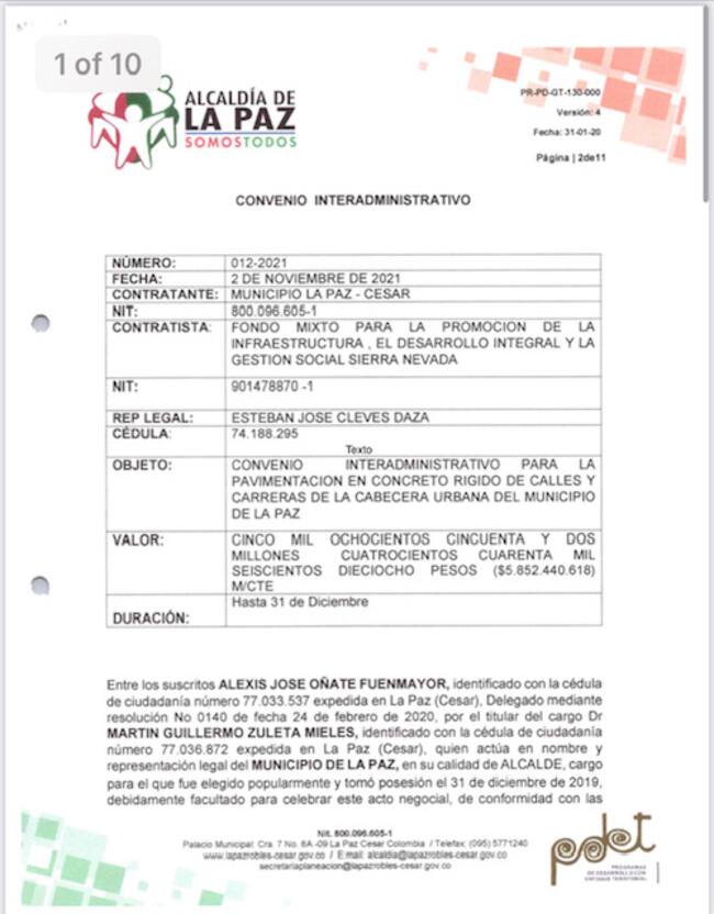 En noviembre de 2021, el alcalde del municipio de La Paz (Cesar), Martin Zuleta Mieles, quien suscribió un convenio por más de 5.800 millones de pesos con el “Fondo Mixto para la Promoción de la Infraestructura el Desarrollo Integral y la Promoción Social Sierra Nevada”, este contrato tenía como fin la pavimentación en concreto de las calles y carreras de la cabecera urbana del municipio de La Paz, en el Cesar.