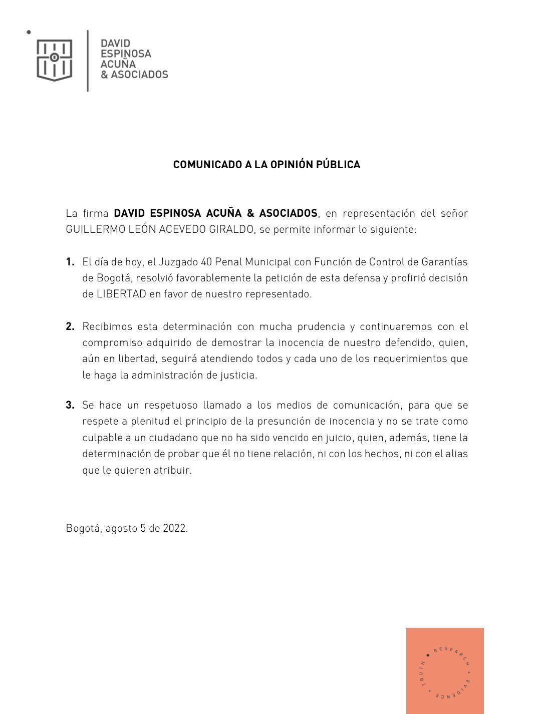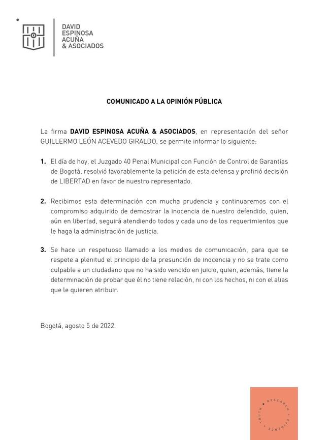 Por vencimiento de términos fue dejado en libertad Guillermo León Acevedo, conocido como ‘Memo Fantasma’.