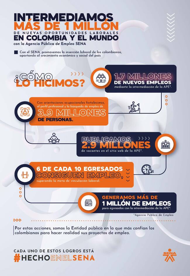 A través de la página web de la Agenda Pública de Empleo (APE) el Sena compartió 2.9 millones de vacantes, lo que permitió 1.7 millones de nuevos empleos.