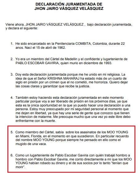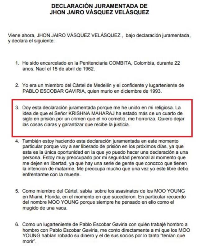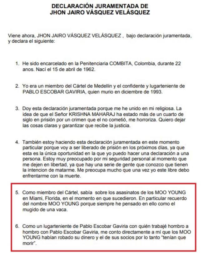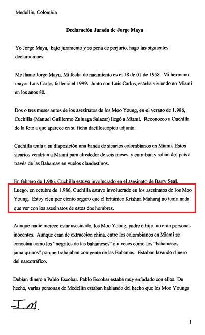 El abogado de Maharaj viajó a Medellín y tiene nueve pruebas que demostrarían que su cliente es inocente. Además, se tiene un testimonio de alias ‘Popeye’, quien el 20 de septiembre de 2013 había realizado una declaración juramentada donde aseguraba que el asesinato de los Moo Young fue ordenado, supuestamente, por Pablo Escobar debido a un robo de dinero.