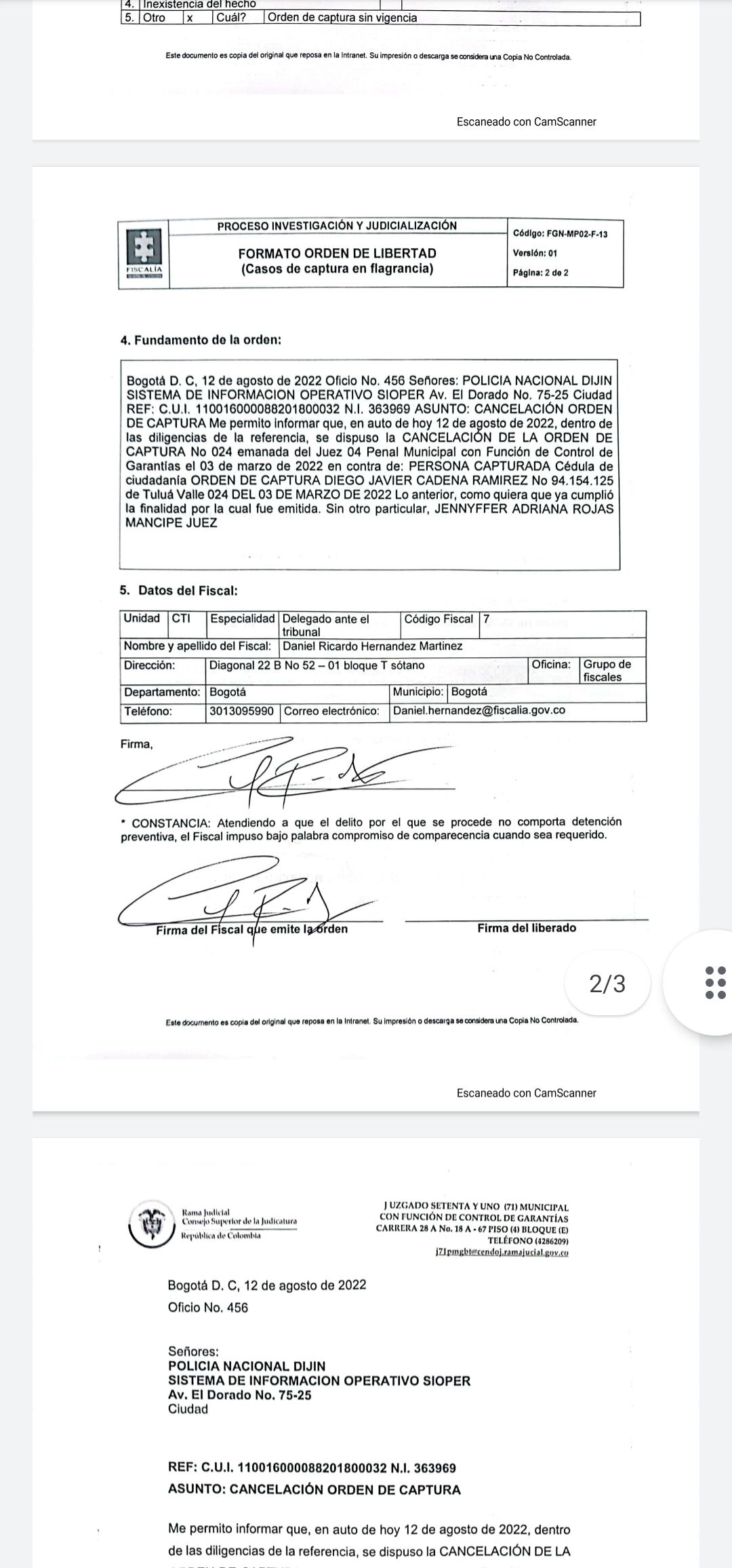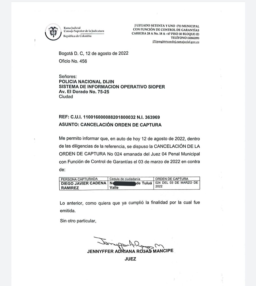En ese sentido, en los sistemas estaba vigente una orden de captura que debía darse de alta por instrucción de la juez 71 de control de garantías de Bogotá.
