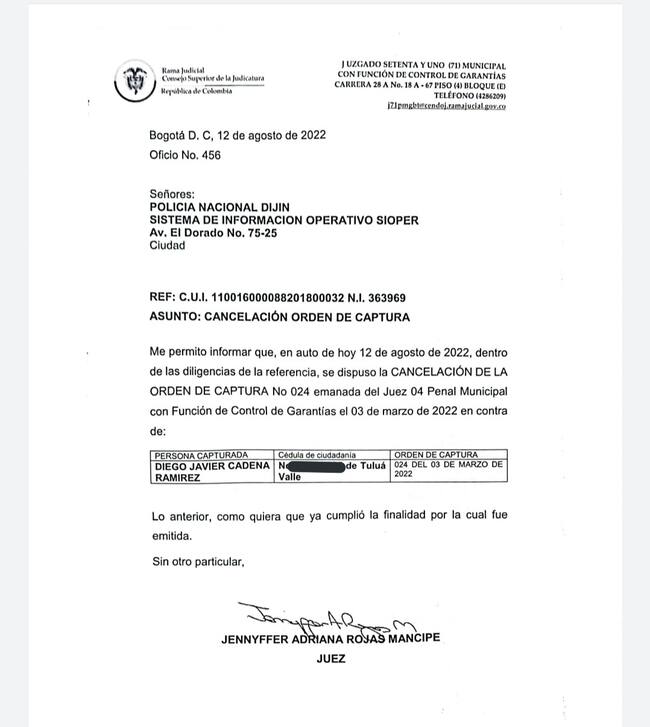 En marzo del año en curso, la funcionaria judicial negó una revocatoria de medida aseguramiento que solicitó la Fiscalía y dispuso la cancelación de la orden de captura contra Cadena. Al parecer, no se cumplieron los trámites necesarios para hacer efectiva esta determinación de la juez.”