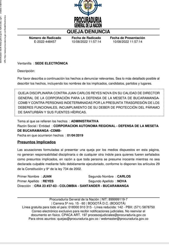 Tras estas alertas, Cristián Avendaño, representante a la Cámara por Santander, denunció penalmente a Juan Carlos Reyes por supuesto omisión en el control ambiental que debió realizar para evitar que el río Suratá se contaminara con mercurio por la minería que se realiza en la provincia de Soto Norte.