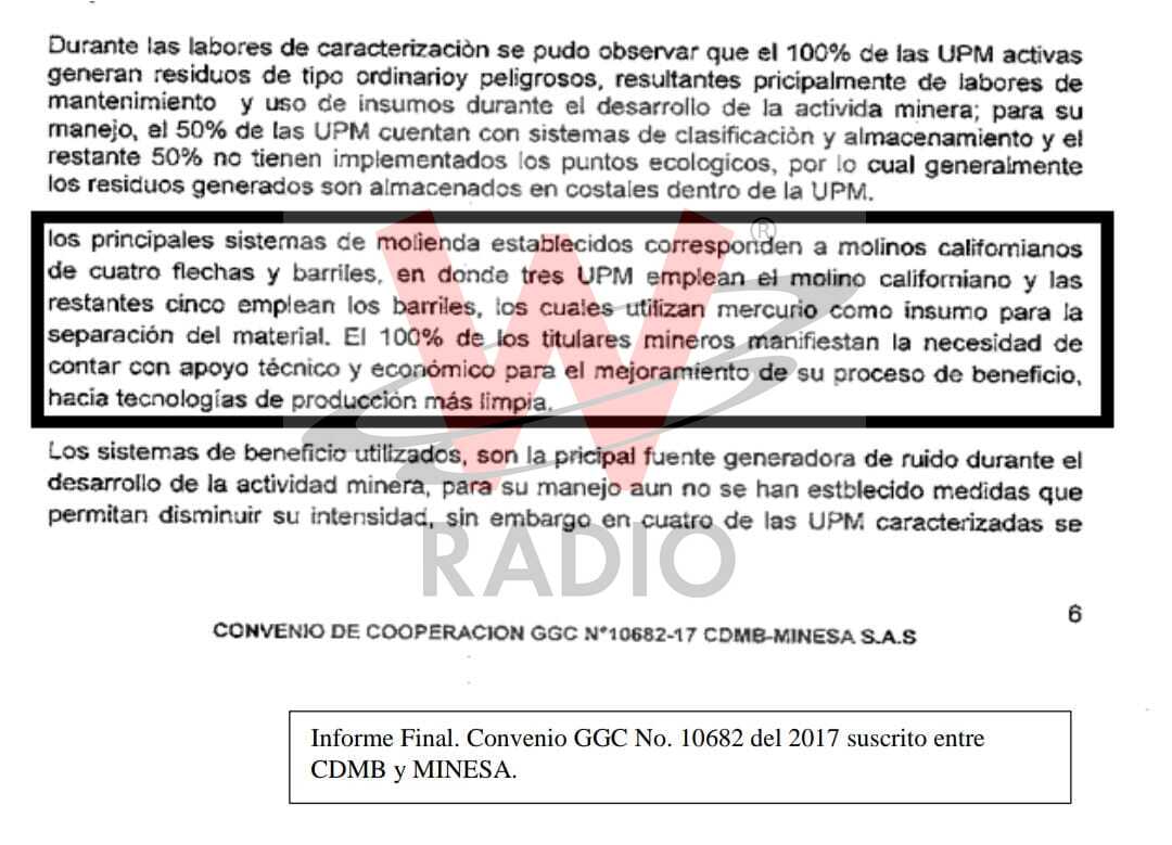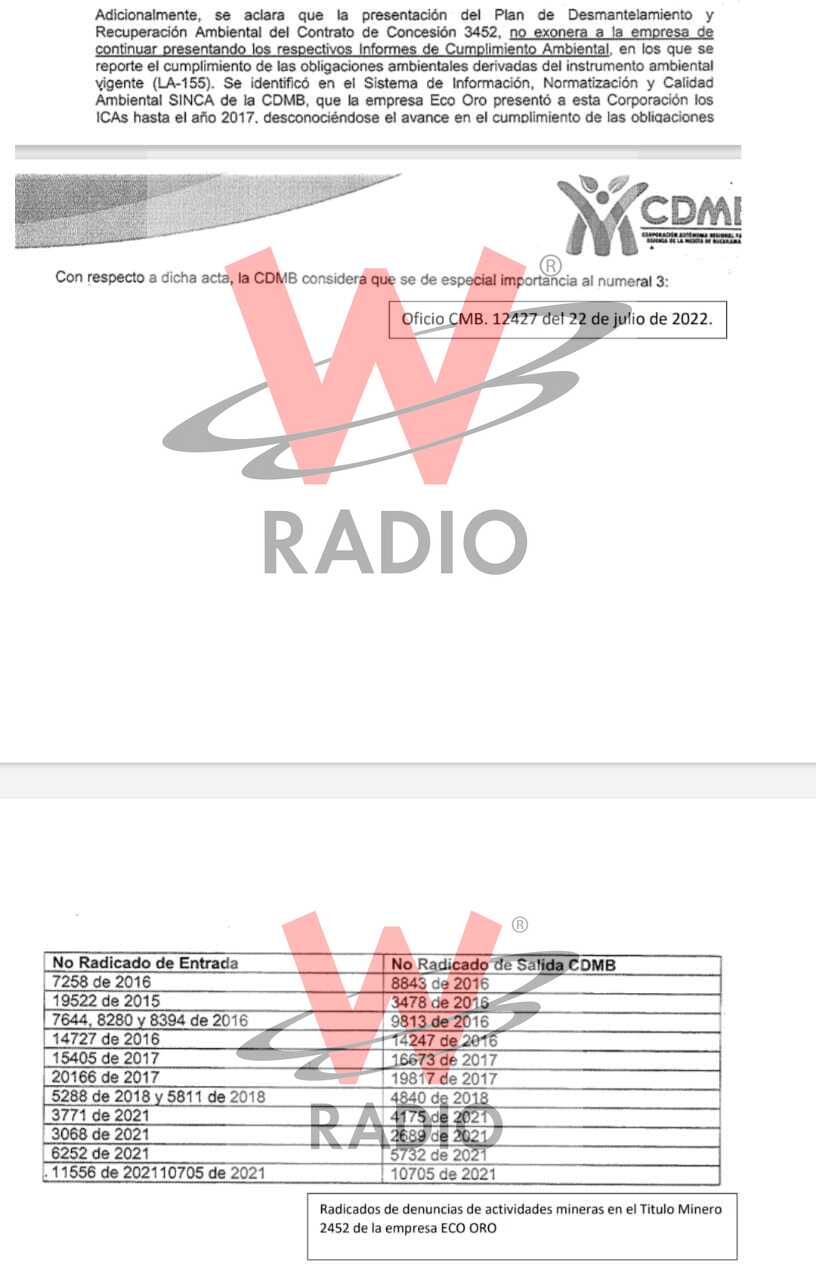 La primera omisión se habría registrado en el 2017 cuando se conoció que la CDMB tuvo un convenio con Minesa y en el que, al parecer, se estaba explotando con mercurio. Siendo así, y según los documentos adjuntos, la autoridad ambiental tampoco habría hecho control al título minero Eco Oro.