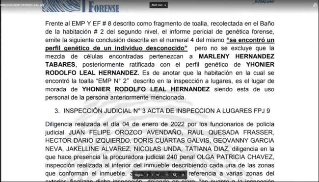 En la diligencia, la abogada Ana Julieth Velásquez presentó un informe realizado de un perito forense que señala que se encontró un perfil genético desconocido, que no coincidiría con el de ninguno de los hermanos Leal ni de la madre de ambos.