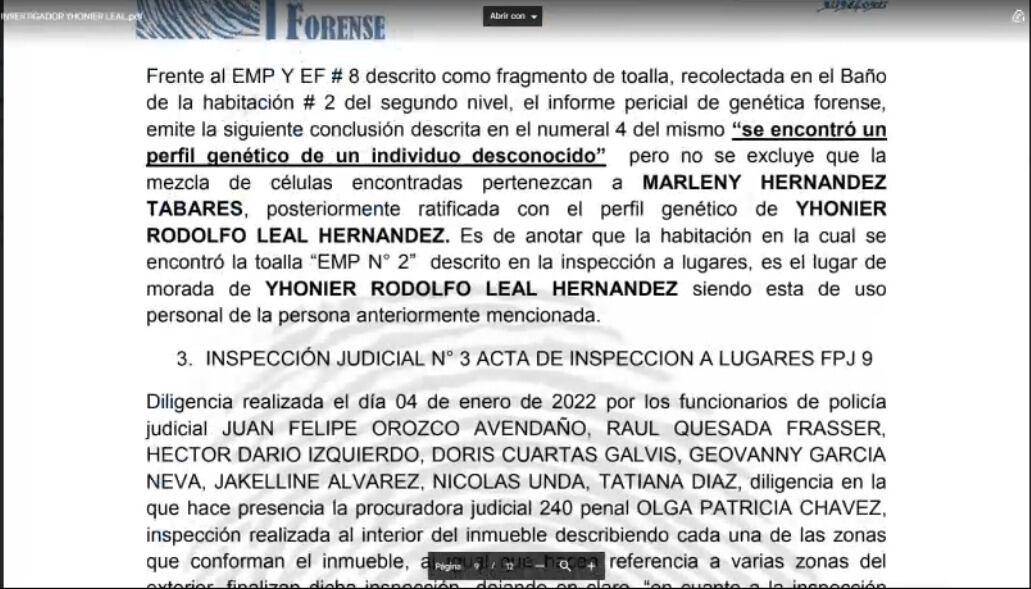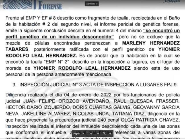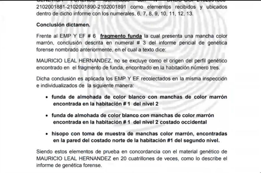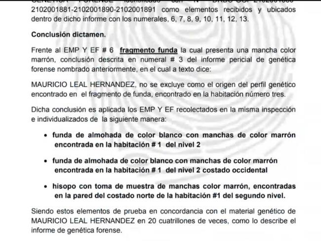 En la diligencia, la abogada Ana Julieth Velásquez presentó un informe realizado de un perito forense que señala que se encontró un perfil genético desconocido, que no coincidiría con el de ninguno de los hermanos Leal ni de la madre de ambos.