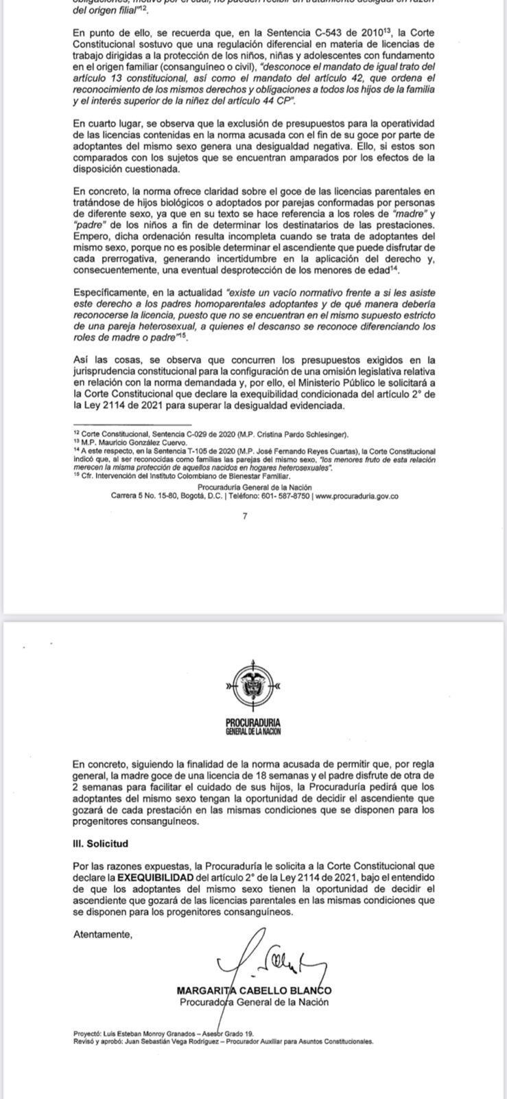 Lo que dice la Procuraduría es que, se declare la Ley constitucional tal y cómo está, sin embargo, que se precise que los padres adoptantes del mismo sexo sean quienes decidan quién gozará de cada prestación en la licencia de maternidad, pero con las mismas condiciones que hay para las parejas heterosexuales, más no repartiendo el tiempo como dice el demandante.
