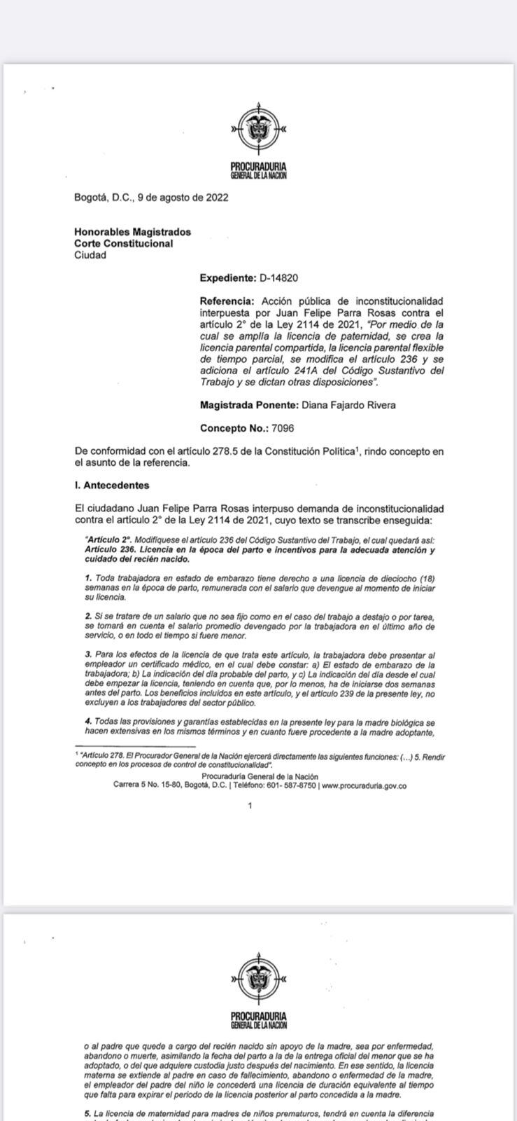 El ente de control ya remitió ante la Corte Constitucional su concepto acerca de una demanda que está estudiando en contra del artículo 2 de la Ley 2114 de 2021, el cual establece la regulación de las licencias de maternidad.