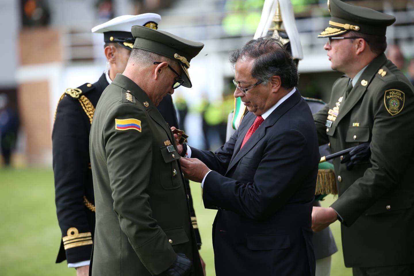 Durante la ceremonia, a la que asistieron la vicepresidenta, Francia Márquez Mina; el ministro de Defensa, Iván Velásquez Gómez; la cúpula de las Fuerzas Militares, el Cuerpo de Generales, monseñor Víctor Manuel Ochoa Cadavid, obispo castrense de Colombia, e invitados especiales, el director general de la Policía Nacional recibió el bastón de mando de manos del jefe de Estado, quien realizó el acto de reconocimiento y toma de mando de los hombres y mujeres que integran la institución.