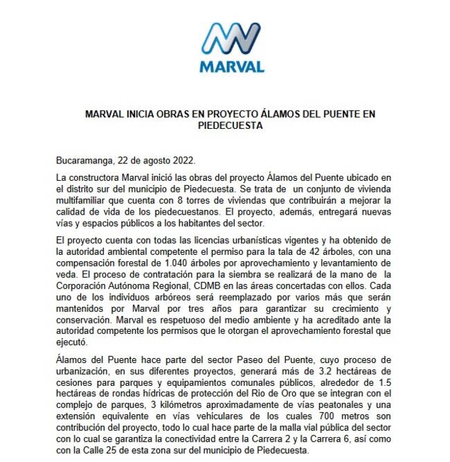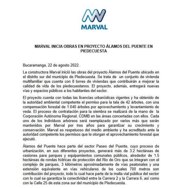 Por su parte, la empresa Marval explicó que en compañía del la autoridad ambiental, CDMB, se hará una compensación forestal de 1.040 árboles, teniendo en cuenta que serán 42 los talados.