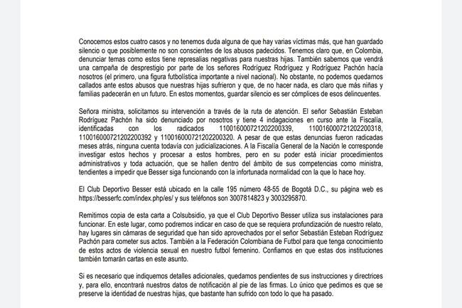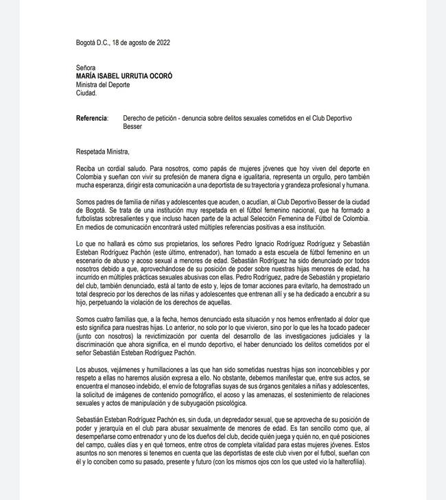 W Radio conoció las denuncias por actos sexuales contra menores de edad realizadas por varios padres de familia de niñas deportistas de la reputada escuela de fútbol Besser que ha entrenado a futbolistas de la Liga de Bogotá, la Selección Sub-17 femenina y de la Selección Femenina de Mayores.