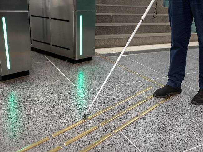 Low section of person with white cane standing at metro station / Johner Images