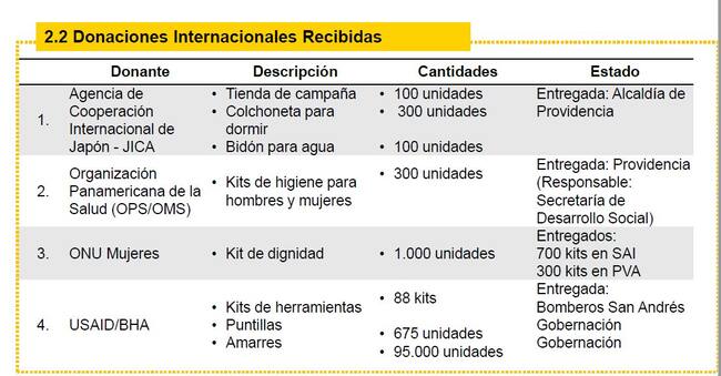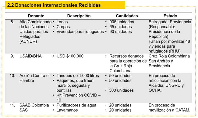 La UNGRD, el 4 de marzo de 2021, entregó un reporte, según el cual se recibieron $6.083 millones en efectivo. De esos $6.083 millones, más de $6.000 millones llegaron de Brasil, Corea del Sur, Andorra, China y de organizaciones de cooperación internacional como el Banco de Desarrollo de América Latina, USAID, el Banco Centroamericano de Integración Económica y el Banco Interamericano de Desarrollo.