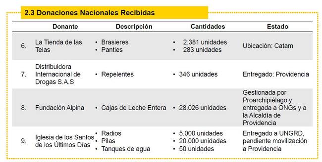 Para esa fecha, $1.098 millones se habrían ejecutado en el programa de comida caliente de la primera dama, la operación logística integral de asistencia humanitaria y el transporte vía marítima entre Cartagena y Providencia, del banco de materiales para la reparación de viviendas afectadas.