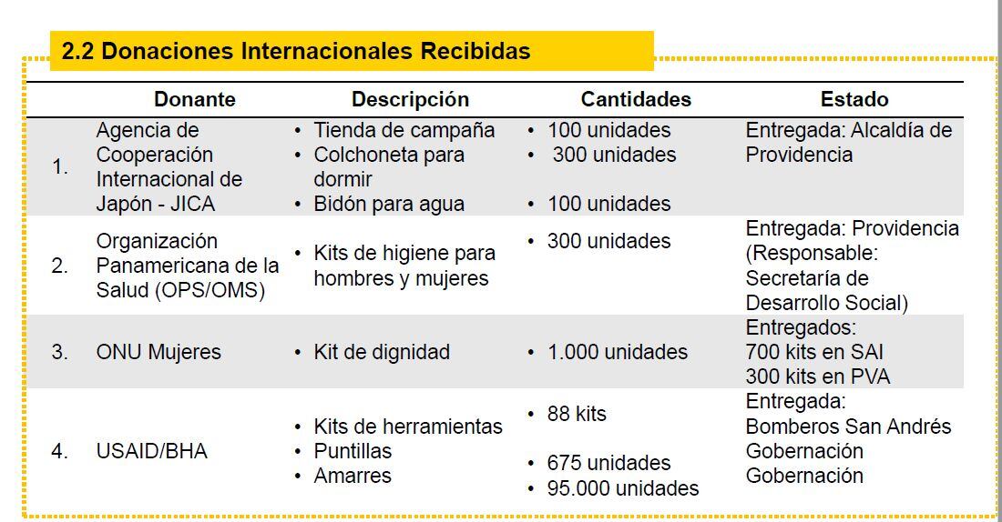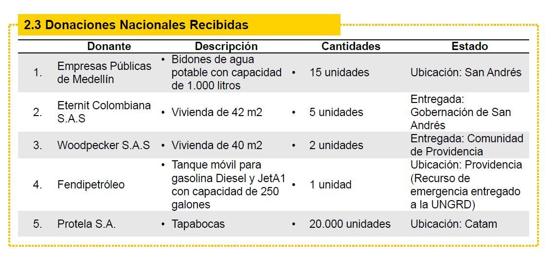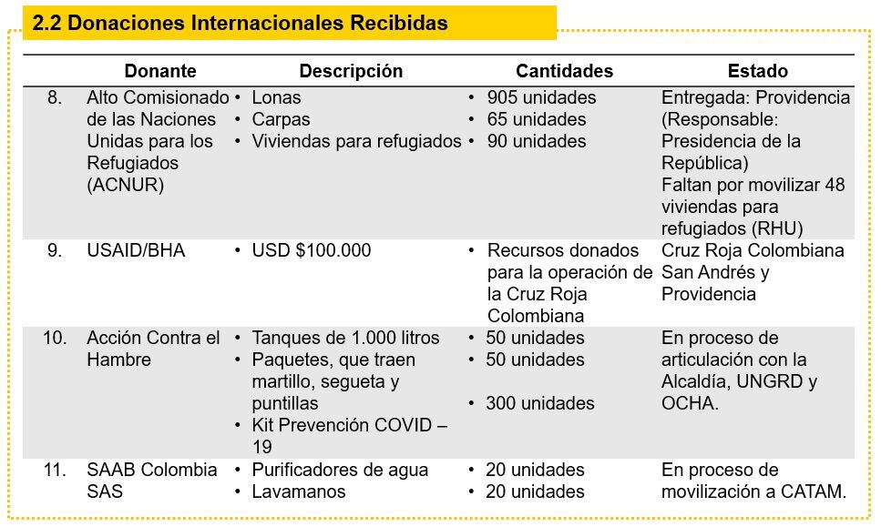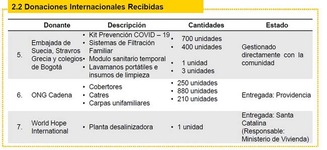 La UNGRD, el 4 de marzo de 2021, entregó un reporte, según el cual se recibieron $6.083 millones en efectivo. De esos $6.083 millones, más de $6.000 millones llegaron de Brasil, Corea del Sur, Andorra, China y de organizaciones de cooperación internacional como el Banco de Desarrollo de América Latina, USAID, el Banco Centroamericano de Integración Económica y el Banco Interamericano de Desarrollo.