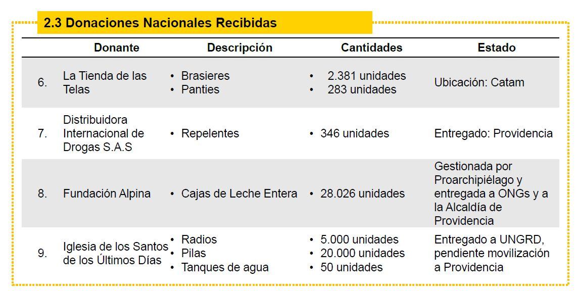 Para esa fecha, $1.098 millones se habrían ejecutado en el programa de comida caliente de la primera dama, la operación logística integral de asistencia humanitaria y el transporte vía marítima entre Cartagena y Providencia, del banco de materiales para la reparación de viviendas afectadas.