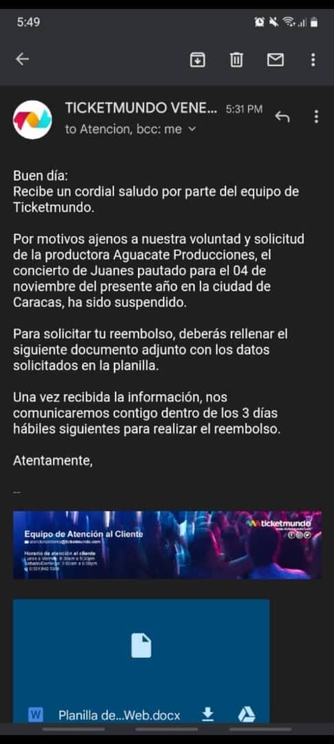 Usuarios mostraban la imagen de un correo cuyo remitente era Ticketmundo Venezuela en el que se señalaba que “por motivos ajenos a nuestra voluntad y solicitud de la productora Aguacate Producciones, el concierto de Juanes pautado para el 04 de noviembre del presente año en la ciudad de Caracas, ha sido suspendido”.