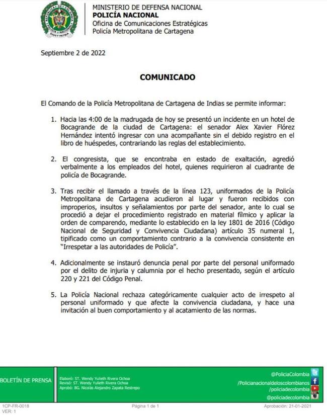 El Comando de la Policía Metropolitana de Cartagena informó por medio de un comunicado que el senador Álex Xavier Flórez Hernández protagonizó un escándalo en un hotel de Bocagrande, Cartagena cuando intentó ingresar con una acompañante sin seguir el registro de invitados, lo que iría en contra de las reglas del lugar.