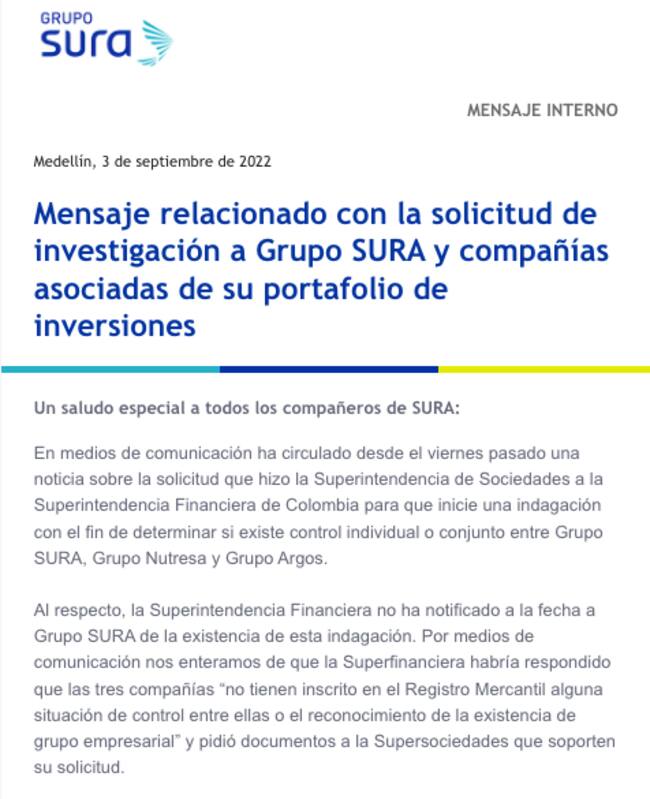 Allí señala que la Superintendencia Financiera “no ha notificado a la fecha a Grupo SURA de la existencia de esta indagación”.