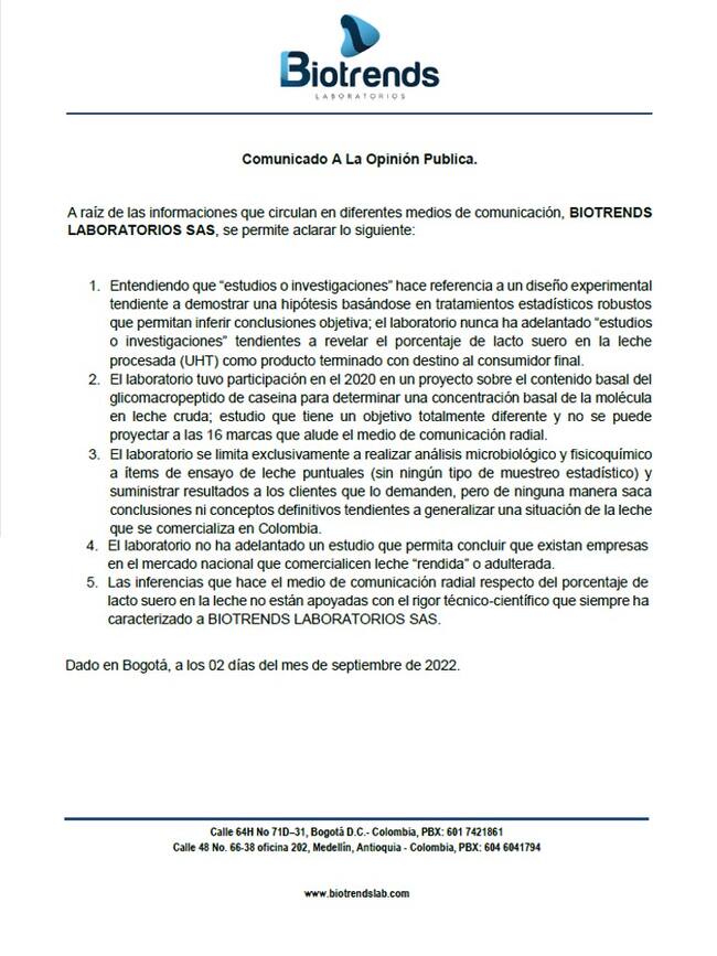 A través de un comunicado, el laboratorio Biotrends se pronunció sobre el informe publicado por La W el pasado 1 de septiembre sobre el lactosuero en la leche.