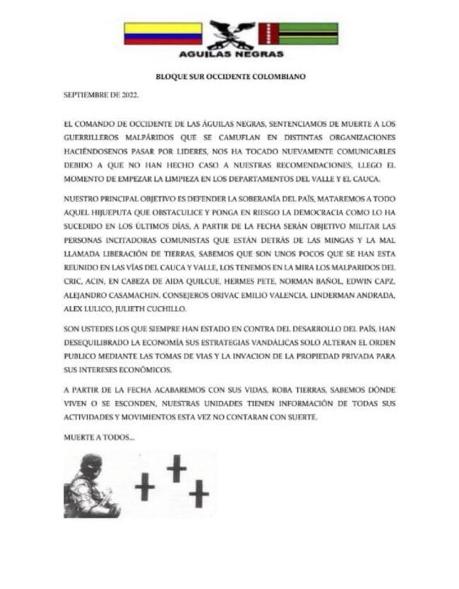 Comenzó a circular un panfleto firmado por las Águilas Negras en el norte del Cauca.