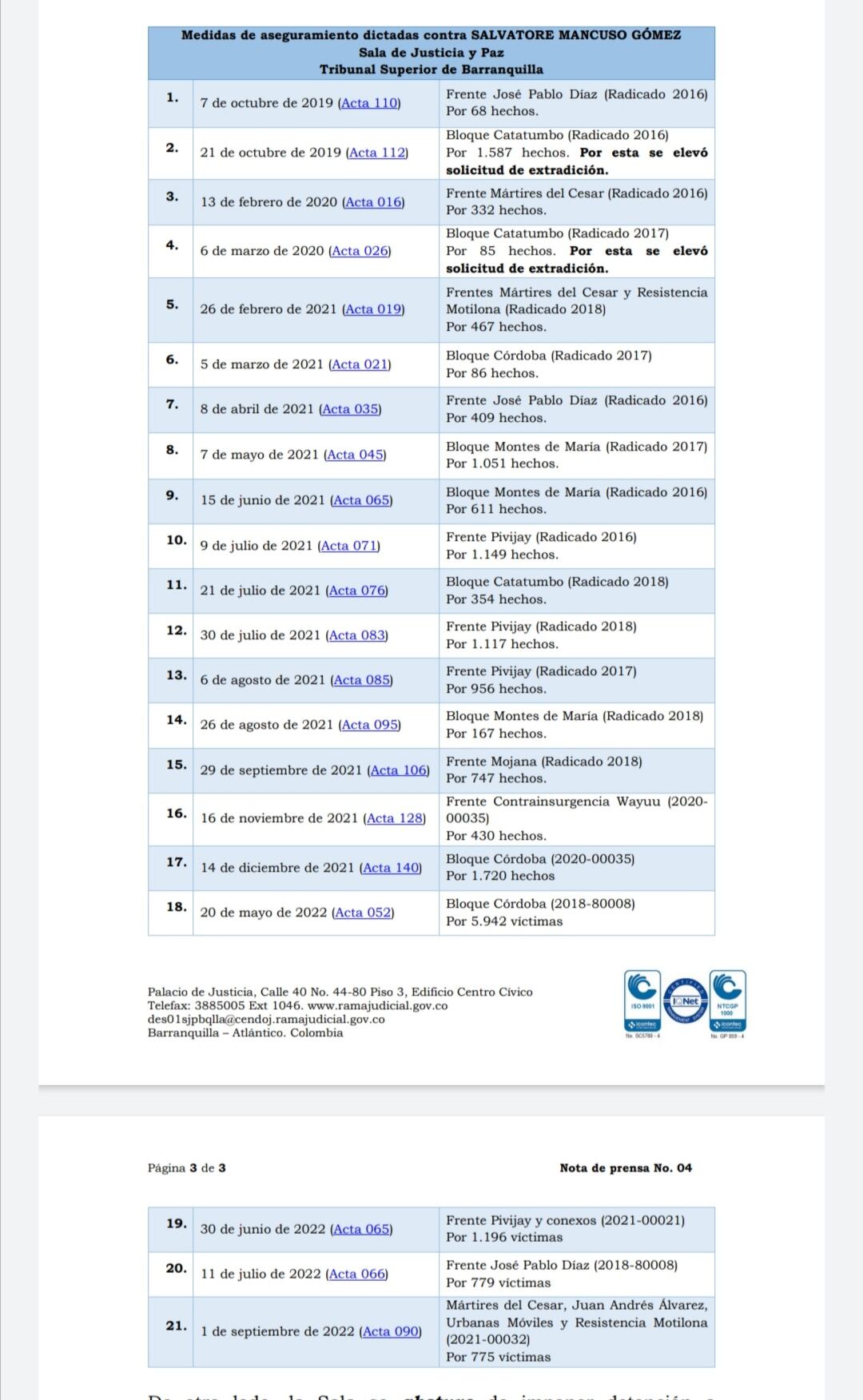 El 2 de septiembre de 2022, el Tribunal de Justicia y paz decidió imponer una nueva medida de aseguramiento, consistente en detención preventiva, al exparamilitar Salvatore Mancuso y otros 16 postulados por crímenes cometidos entre 1996 y 2006 en los departamentos de Atlántico, Bolívar y Magdalena.