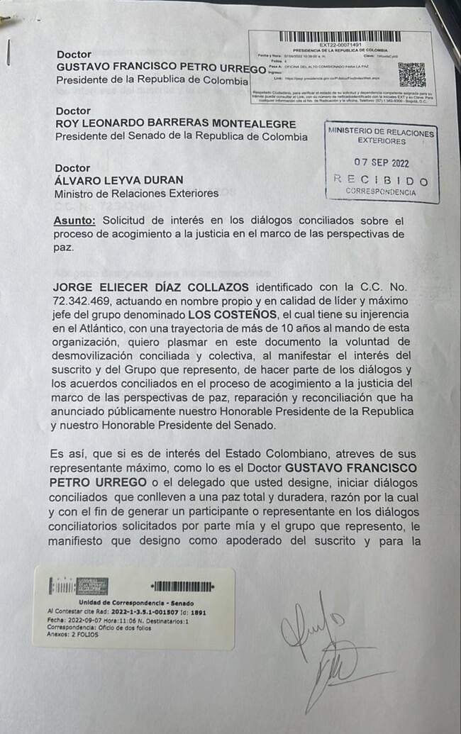 “Plasmo la voluntad de desmovilización consolidada y colectiva al manifestar el interés del grupo que represento de hacer parte de los diálogos de los acuerdos conciliados en el proceso de acogimiento la justicia del marco de la perspectiva de paz, reparación y conciliación que ha anunciado públicamente el presidente de la República, Gustavo Petro”, dice la carta radicada hoy.