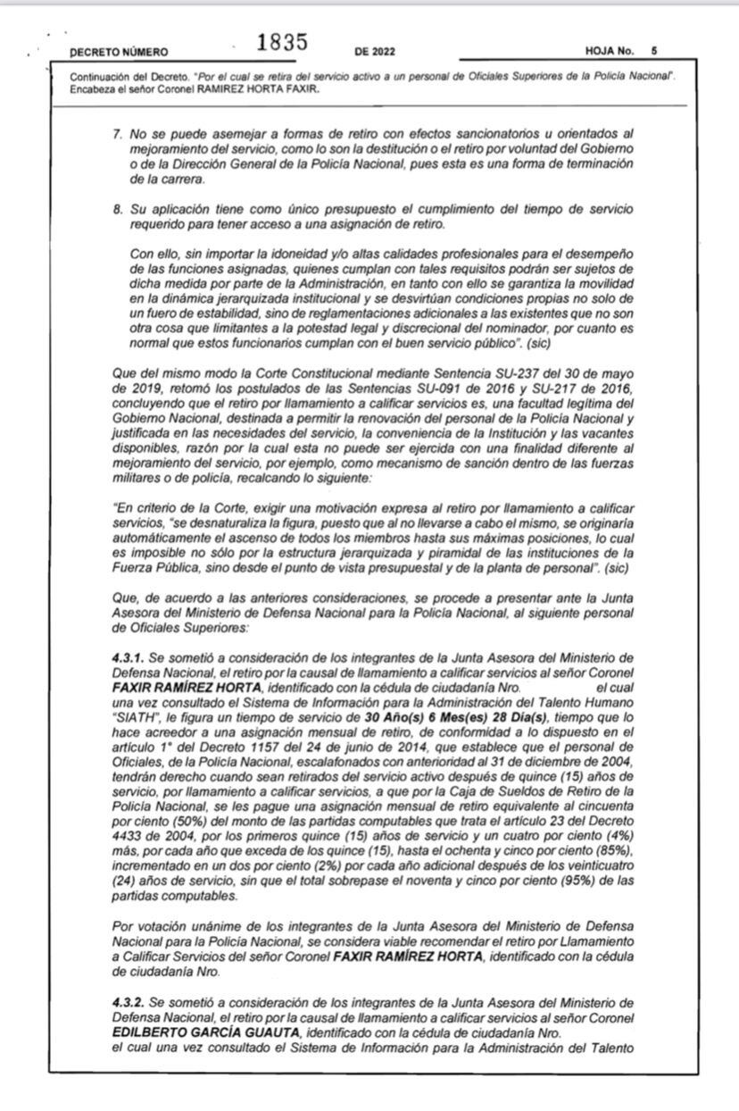 En las últimas horas, se conoció un decreto por parte del Ministerio de Defensa, en donde se llama a calificar servicios a tres coroneles activos de la Policía Nacional, uno de ellos actualmente estaba haciendo un curso para general de la República. Así las cosas, se trata de los oficiales, Faxir Ramírez Horta, Edilberto García Guauta, además de Hilbar Alfonso Reyes Cruz.