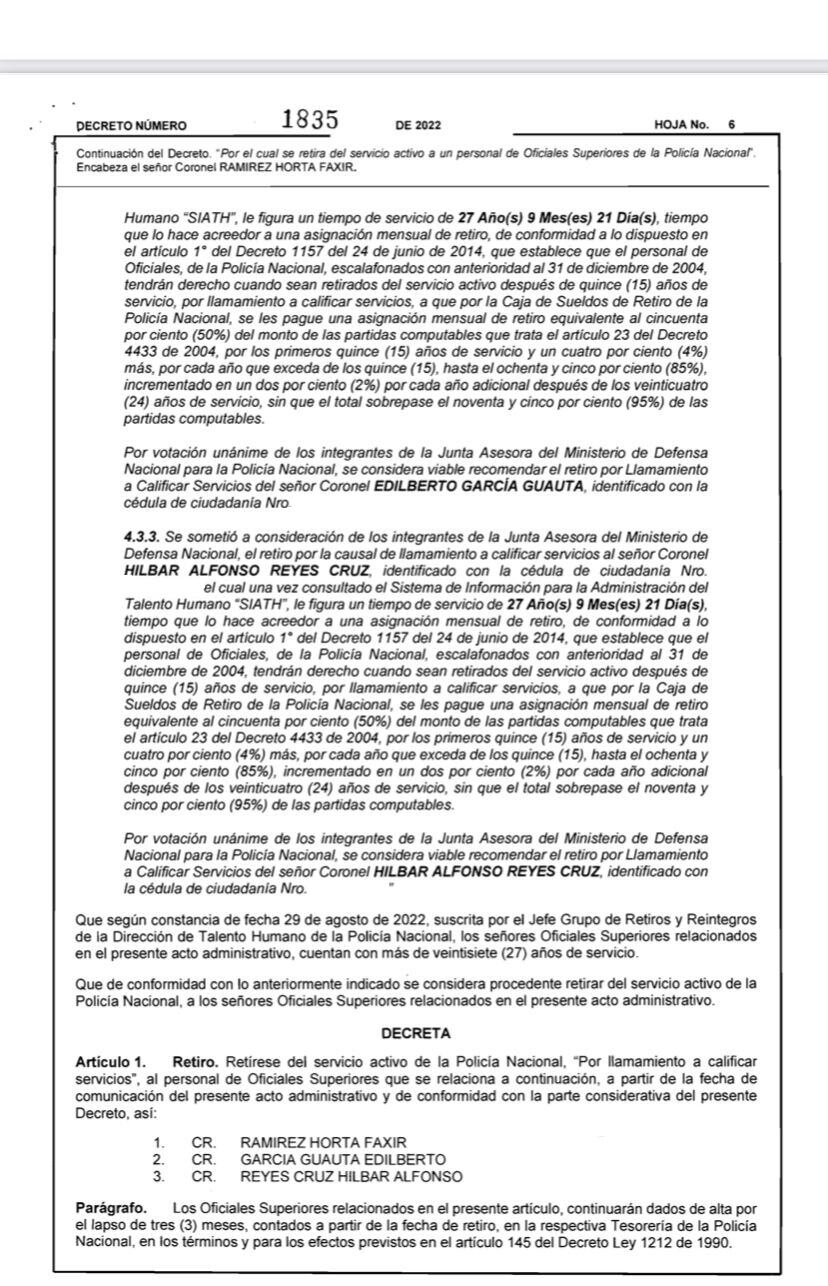 Por su parte el coronel Hilbar Alfonso Reyes Cruz, era el subcomandante de la Policía Metropolitana de Cúcuta. “Se sometió a consideración de los integrantes de la Junta Asesora del Ministerio de Defensa Nacional, el retiro por la causal de llamamiento a calificar servicios al señor coronel, el cual una vez consultado el Sistema de Información para la Administración del Talento Humano ´SIATH´, le figura un tiempo de servicio de 27 años,” señala el decreto de retiro.