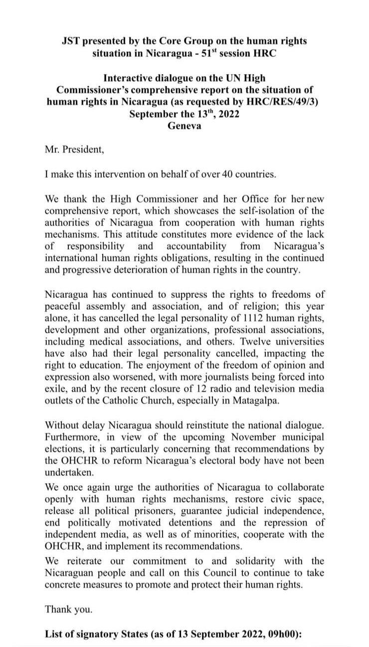 En el documento firmado, más de 40 países de deja claro que, Nicaragua continúa “reprimiendo los derechos a las libertades de reunión pacífica y asociación, y de religión; solo este año, ha cancelado la personalidad jurídica de 1112 organizaciones de derechos humanos, desarrollo y otras”.