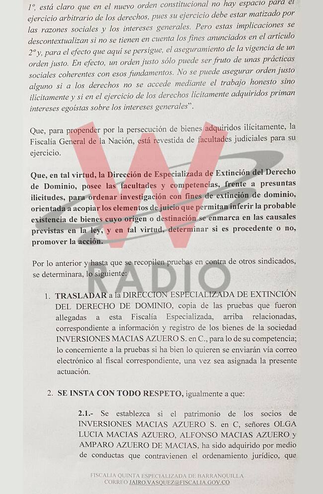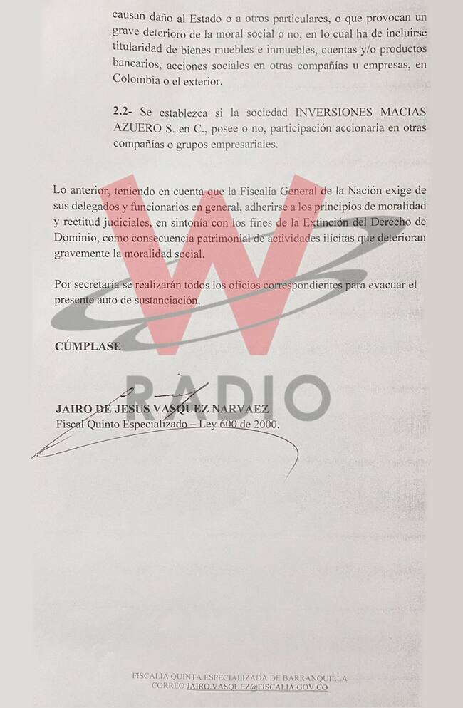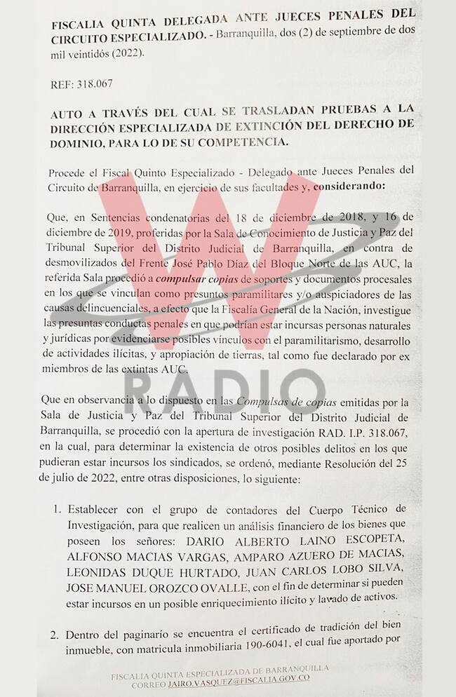 La W conoció el auto de la Fiscalía Quinta Delegada ante Jueces Penales del Circuito Especializado a través del que se dio el traslado de pruebas a la Dirección Especializada de Extinción del Derecho de Dominio, para que se investiguen las presuntas conductas penales de personas naturales y jurídicas con posibles vínculos con el paramilitarismo.