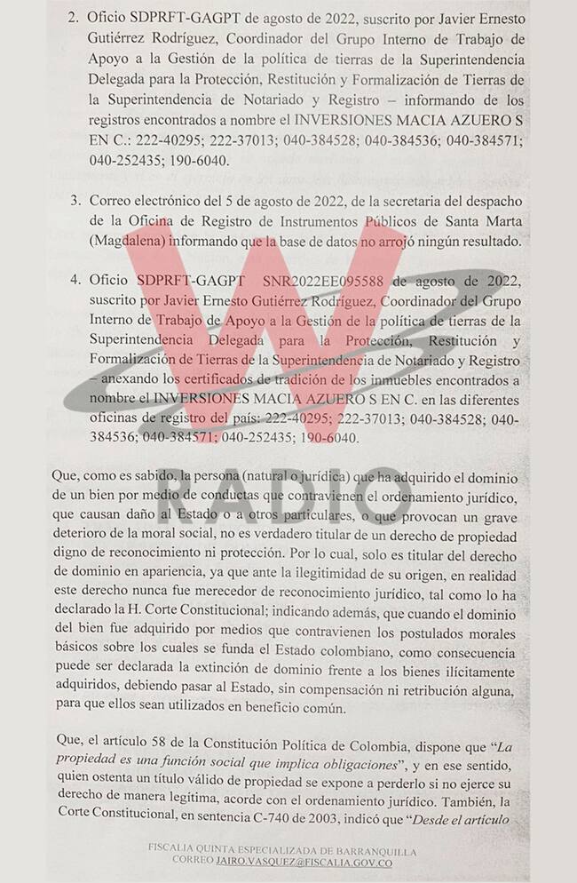 Asimismo, mencionaron a la Finca Potosí, de propiedad de la empresa Inversiones Macías Azuero Compañía S. EN C, para que se estableciera en qué circunstancias fue creada, al mismo tiempo que se le pidió a la Oficina de Instrumentos Públicos de Barranquilla, Santa Marta, Cartagena y Bogotá, entregar una lista con los bienes a su nombre.