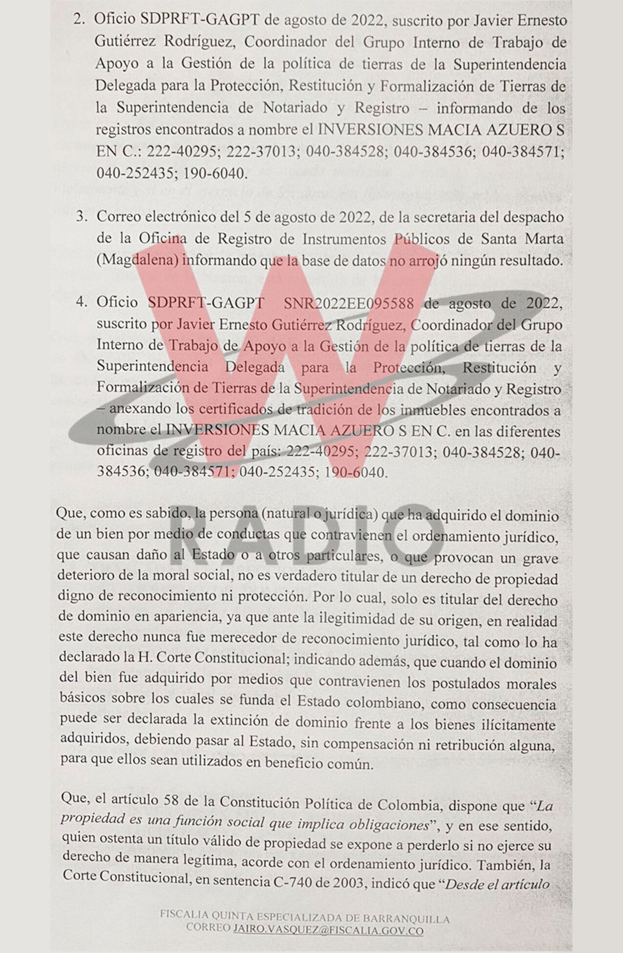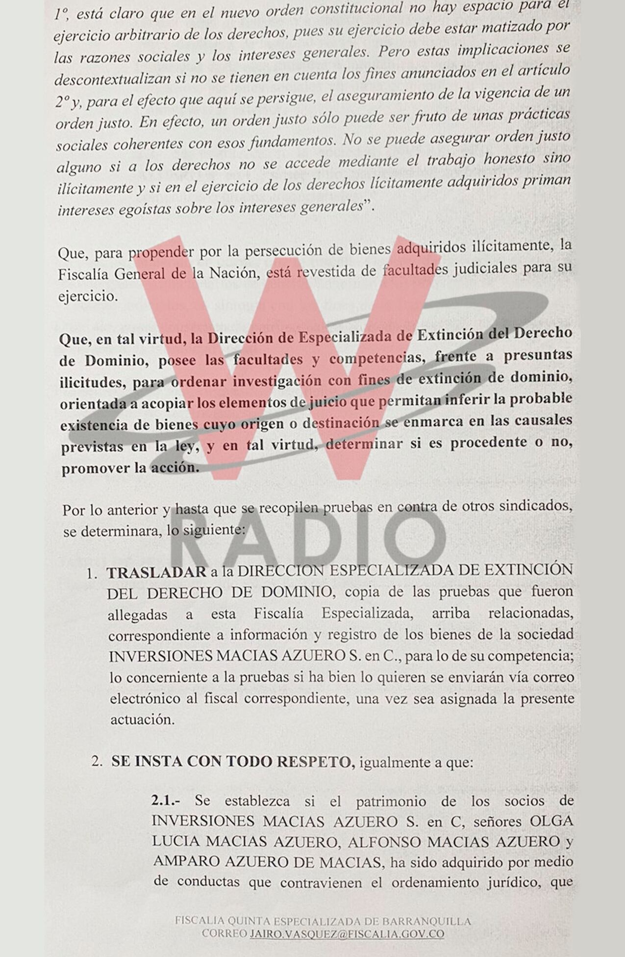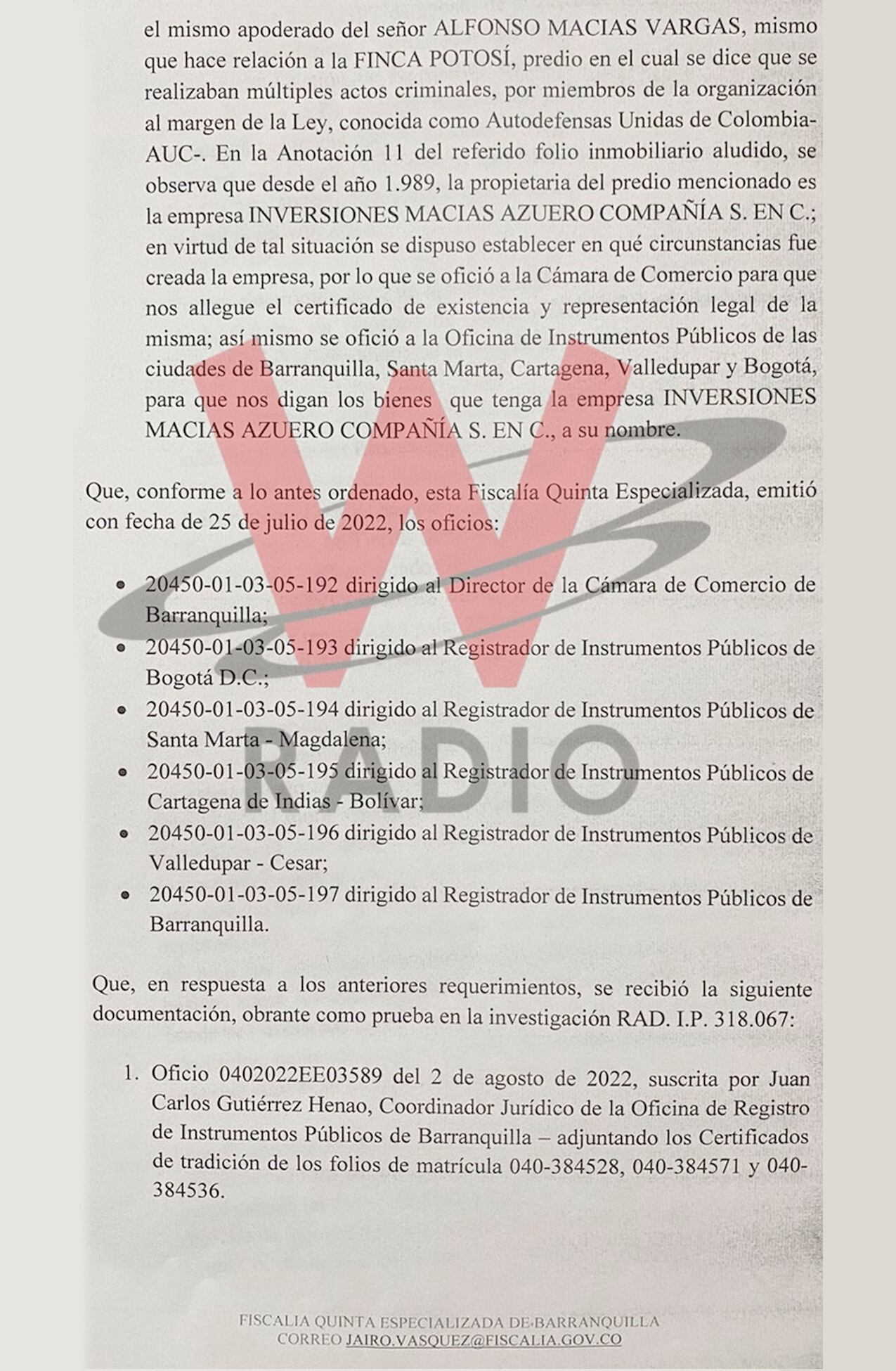 La W conoció el auto de la Fiscalía Quinta Delegada ante Jueces Penales del Circuito Especializado a través del que se dio el traslado de pruebas a la Dirección Especializada de Extinción del Derecho de Dominio, para que se investiguen las presuntas conductas penales de personas naturales y jurídicas con posibles vínculos con el paramilitarismo.