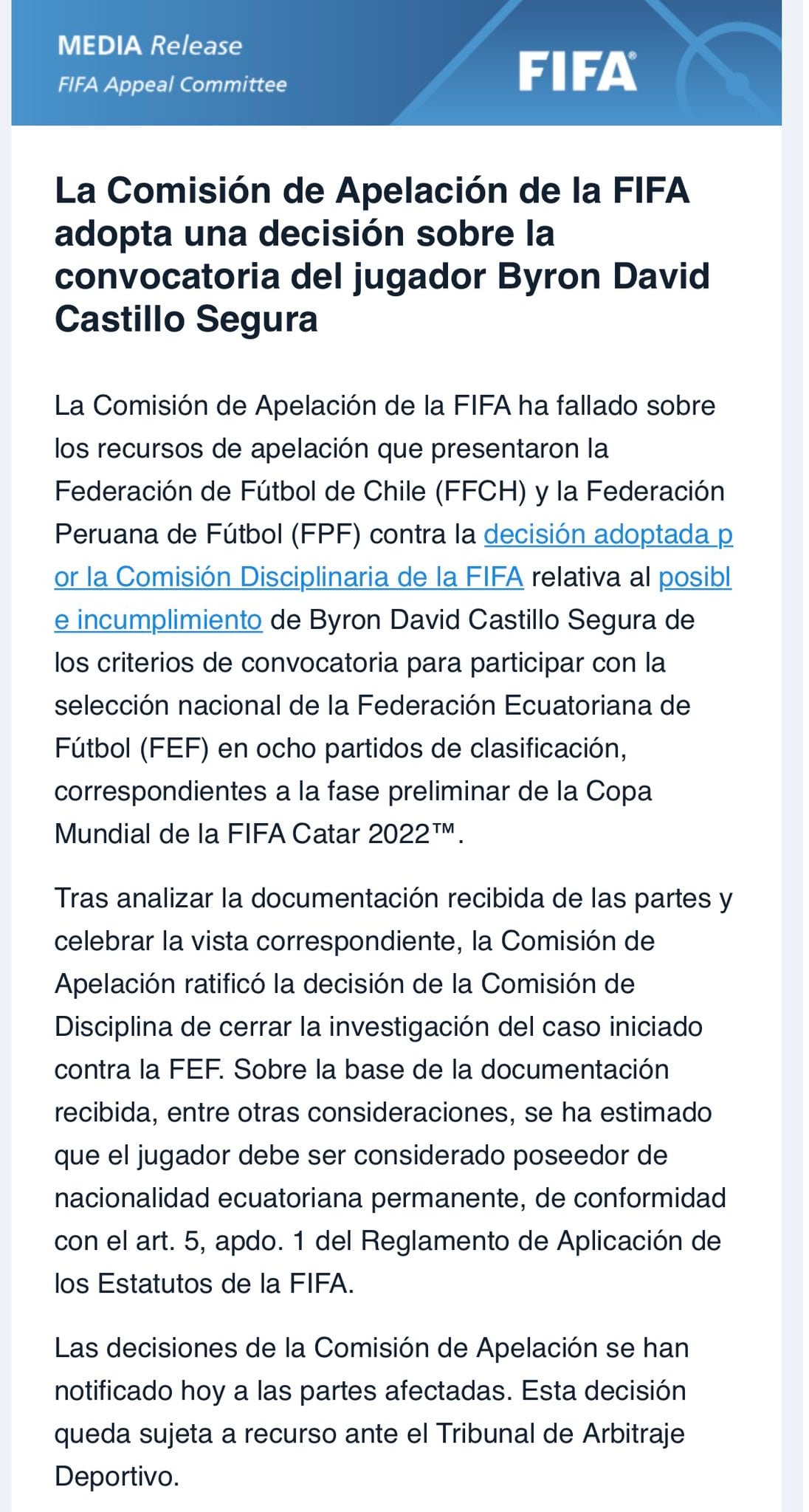 El Comité de Apelación de la FIFA desestimó la reclamación de las federaciones de Chile y Perú contra Ecuador por alineación indebida del jugador Byron Castillo en la fase de clasificación para el Mundial de Qatar 2022, y ratificó la participación del conjunto ecuatoriano en la competición.