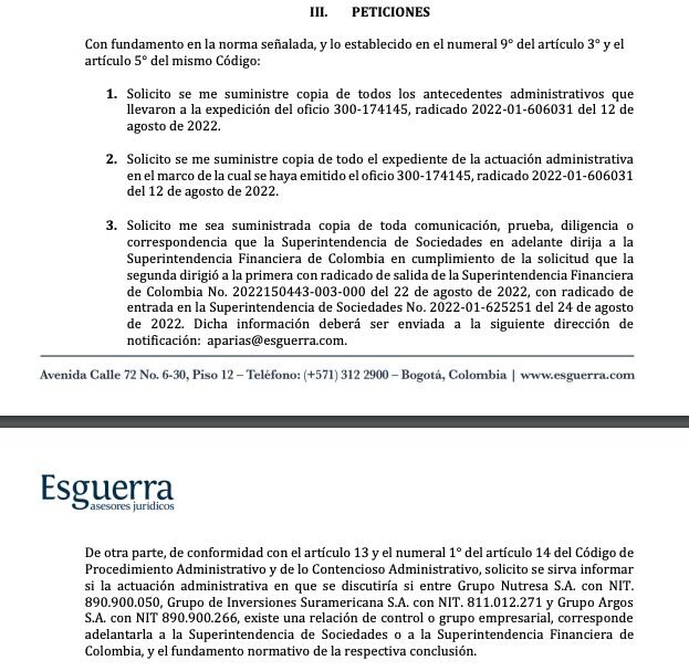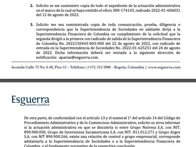 La W conoció en primicia un derecho de petición que remitió el apoderado del presidente de Grupo Sura, Gonzalo Pérez, ante la Superintendencia Financiera y de Sociedades en el que pide explicaciones sobre la solicitud de indagación a las empresas del Grupo Empresarial Antioqueño (GEA) para determinar si operan como estructura de control.